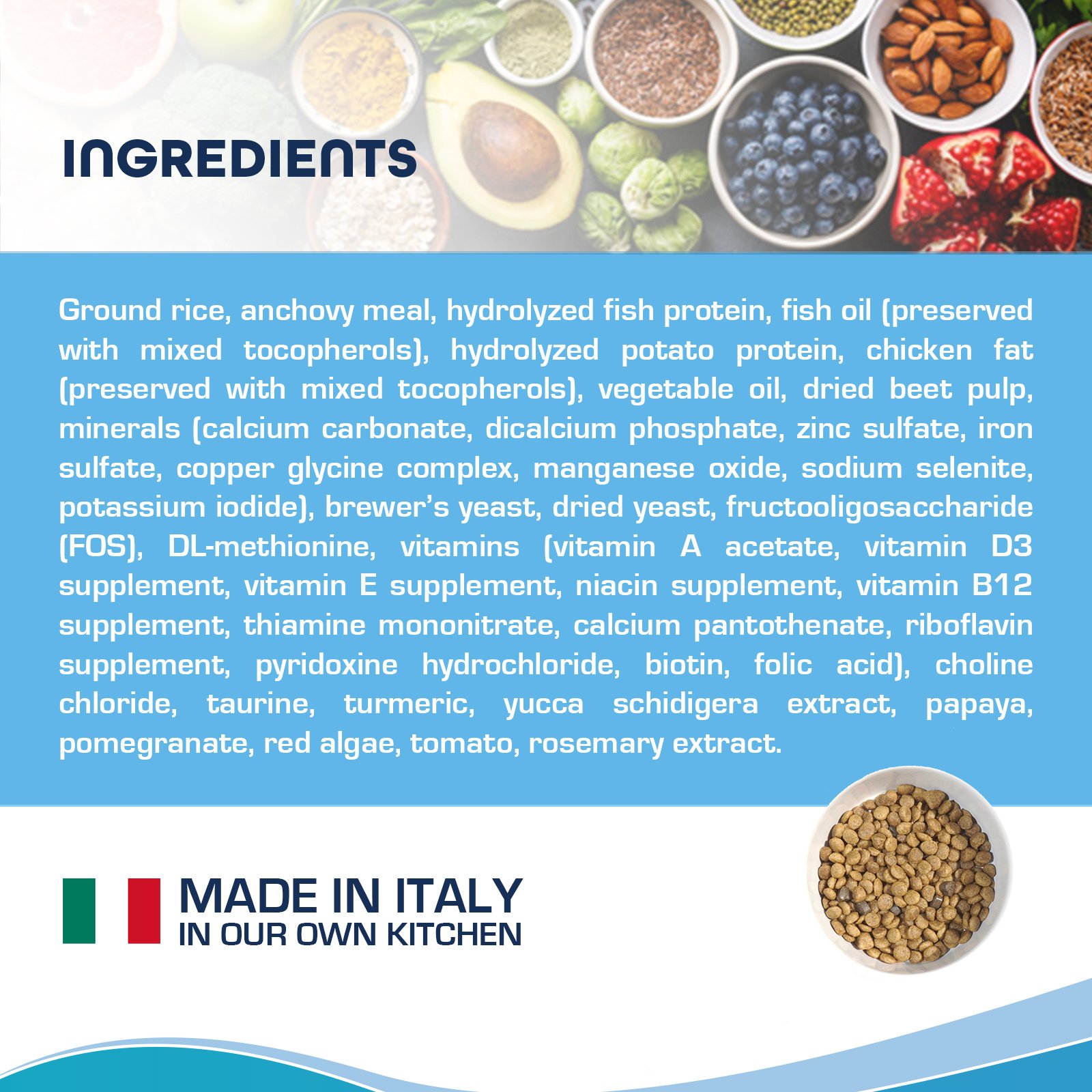 Ground rice, anchovy meal, hydrolyzed fish protein, fish oil (preserved with mixed tocopherols), hydrolyzed potato protein, chicken fat (preserved with mixed tocopherols), vegetable oil, dried beet pulp, minerals (calcium carbonate, dicalcium phosphate, zinc sulfate, iron sulfate, copper glycine complex, manganese oxide, sodium selenite, potassium iodide), brewer's yeast, dried yeast, fructooligosaccharide (FOS), DL-methionine, vitamins (vitamin A acetate, vitamin D3 supplement, vitamin E supplement, niacin supplement, vitamin B12 supplement, thiamine mononitrate, calcium pantothenate, riboflavin supplement, pyridoxine hydrochloride, biotin, folic acid), choline chloride, taurine, turmeric, yucca schidigera extract, papaya, pomegranate, red algae, tomato, rosemary extract.