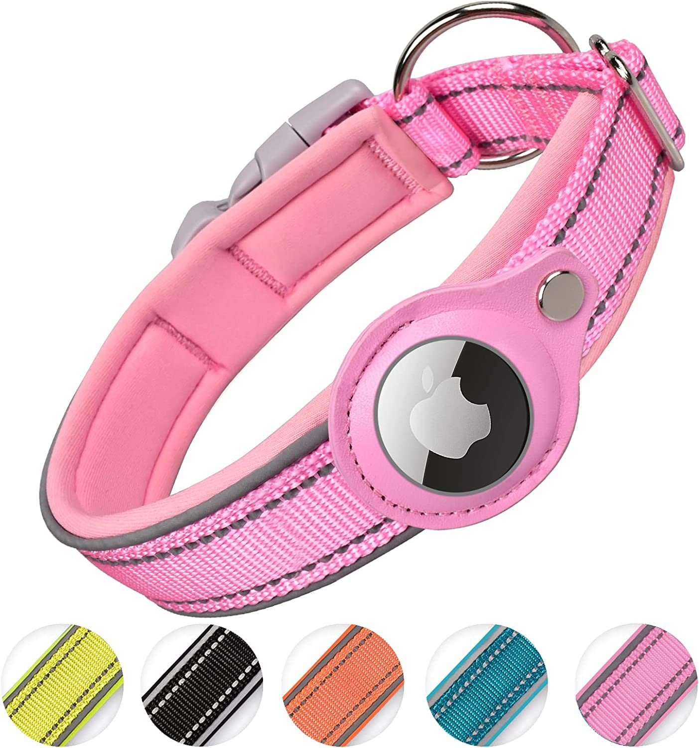 INTEGRATED DESIGN FOR AIRTAG: Are you always wondering where is your dogs or cats? Or are you always trying to find him/her? We're proud to announce our latest AirTag Dog Collar; integrated the AirTag Holder with premium basic Dog Collar. With our AirTag Dog Collar; allows you to keep tracking your beloved ones! (Note: The AirTag is not included) FIRM & COST EFFECTIVE: Bolting with the screw; the built-in leather pocket as Dog AirTag Holder is a perfectly fit and prevents your AirTag to lose or drop from it. 100% firmly combined with the Dog Collar; ensures your Apple AirTag stay connected with your dogs/cats. Plus; you won't need to purchase other detached; easily lost AirTag products. PREMIUM MATERIAL: Designed with premium material; reflective stripe; waterproof webbing and strict stitching ; our Air Tag Dog Collar is also featured with soft neoprene padding; prevent your dog's from any irritation or discomfort. No sharp edges or unfold sewing join; and sturdy premium plastic buckle and alloy D-ring ensures your dog's safety. PRODUCT FUNTIONS ENGINNERING: Our Air Tag Dog Collar is more convenient to release with the one-hand quick release buckle; and the D-ring provides a secure attachment for your dog leash and hanging accessories. The strong reflective stitching and edges make your dog's easier to be seen in darkness; safer for walking; running or jogging in the wild. MULTIPLE SIZE OPTIONS: The whole package includes: Airtag Dog Collar x1; Screwdriver x1. Our heavy duty Dog Collar comes with 4 colors and 4 sizes; perfect for small; medium and large dogs. Please measure your dog's neck before your purchase. S: 12"-14"; M: 15"-18"; L: 17"-20"; XL: 19"-22". (Neck Circumference in INCHES)