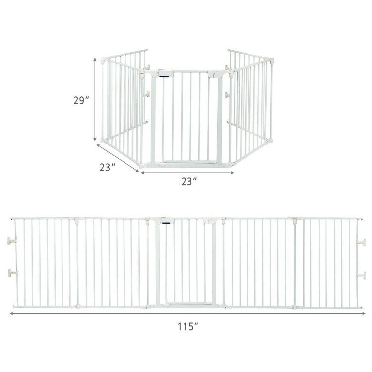 Crafted from heavy-duty steel with exclusive finish; this gate has sturdy and durable structure for long time service. Designed with a walk-through door with safety lock; it provides ultimate security and easy to open with one hand. It has 5 panels that can be made into any shape you want. This multifunctional gate is perfect for any indoor environment; such as doorway; hallway and grills. You can set it freely on floor or mounted to the wall in order to create space where the baby or pet can play safely by themselves.