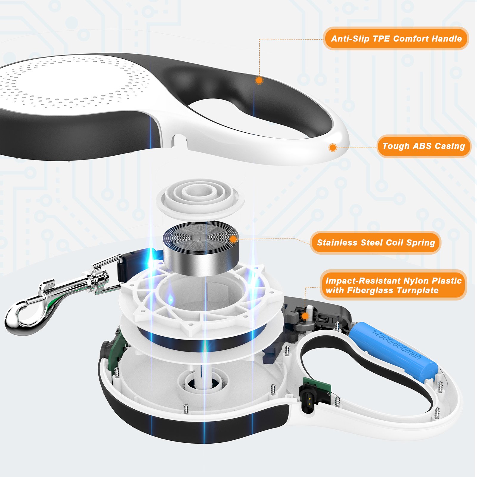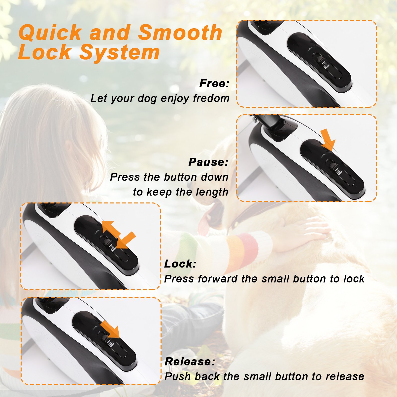 4.Aesthetic Design and Ergonomic Handle, Anti-Slip TPE handle is made of durable soft material & super comfortable grip,providing enjoyable walking experience with your pets. And the design is neat,aesthetic and ergonomic, easy to operate and you can pause, lock or release it with a single hand.