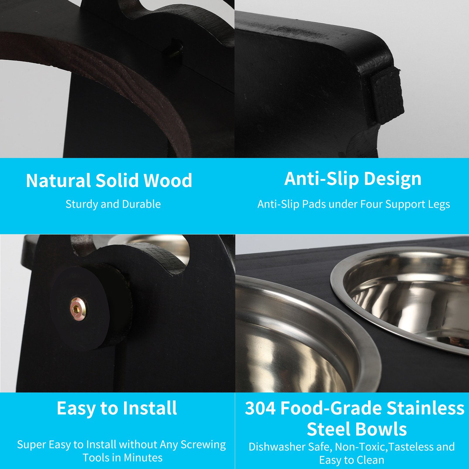 5.Double Stainless Steel Food and Water Bowls Can be Taken out From Stand at any time for Easily Cleaning and Dishwasher Safe, The Solid Wood Surface won’t get Mouldy Even It gets Wet by Food or Water.