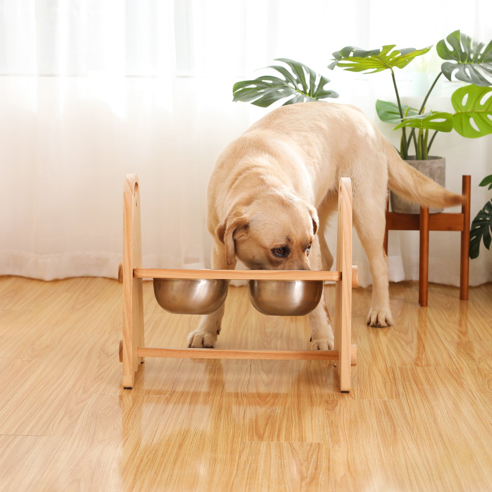 5.Double Stainless Steel Food and Water Bowls Can be Taken out From Stand at any time for Easily Cleaning and Dishwasher Safe, The Solid Wood Surface won’t get Mouldy Even It gets Wet by Food or Water.