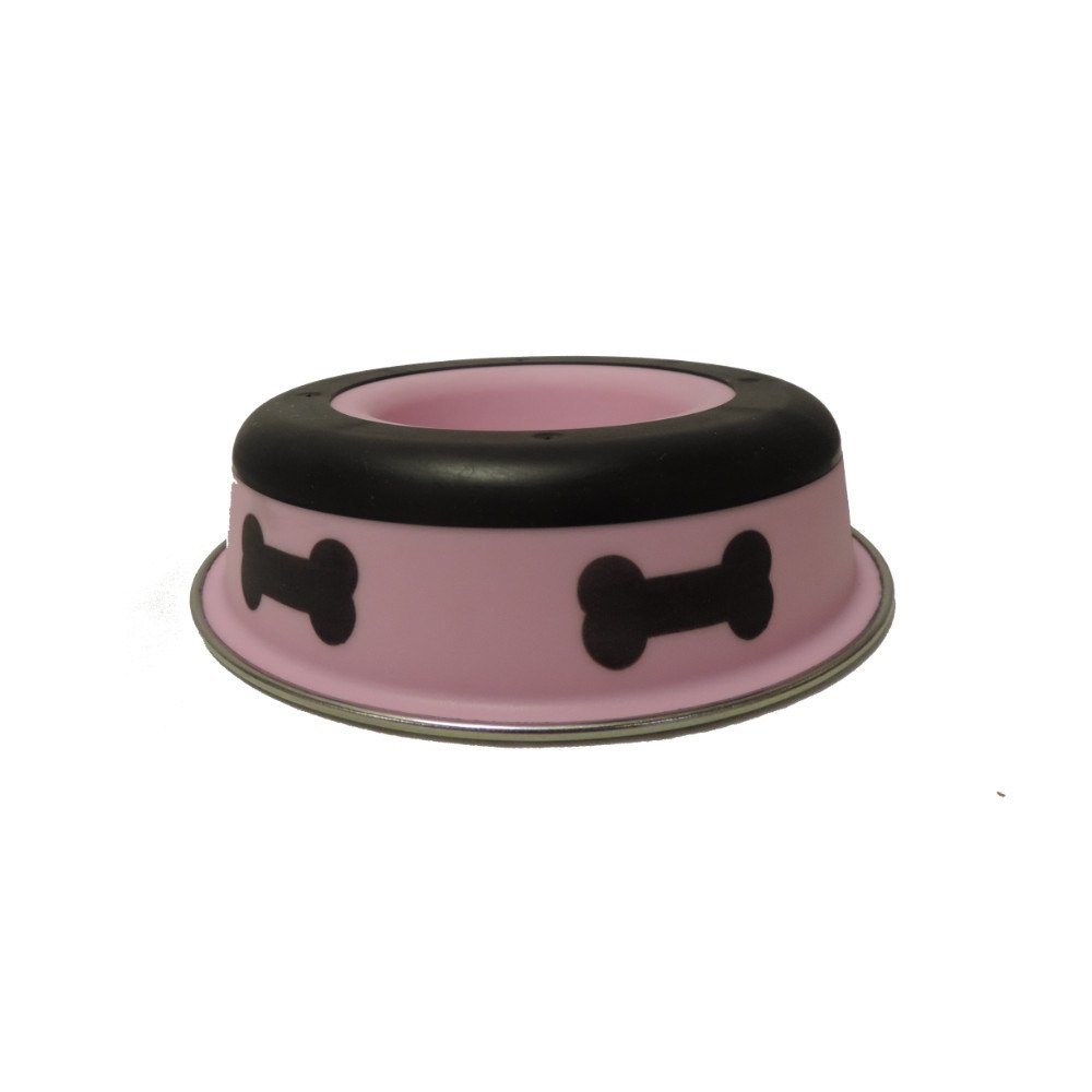 Home > Slow Feeder Spill Proof Pet Bowl with Rubber Base and Bone Design; Pink and Black